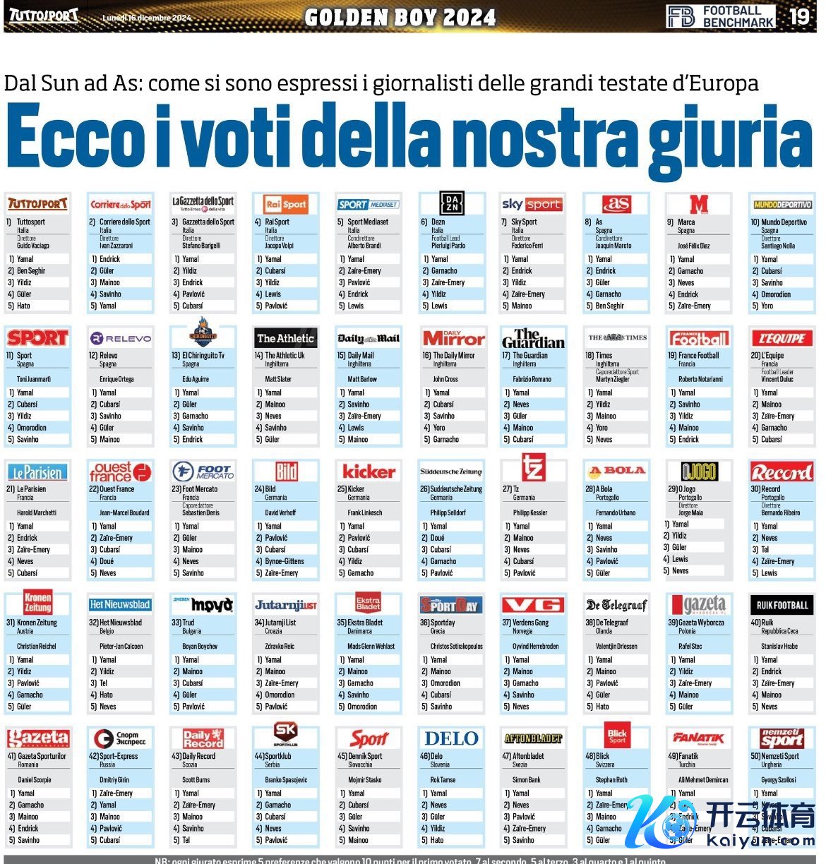 12月17日讯 《齐灵体育报》公布了本年的金童奖投票明细情况,一共有50家媒体参与金童奖投票,一起媒体投票中齐有亚马尔,唯有2家媒体的首选票不是亚马尔,永别是意媒《罗马体育报》、俄媒《体育快报》。