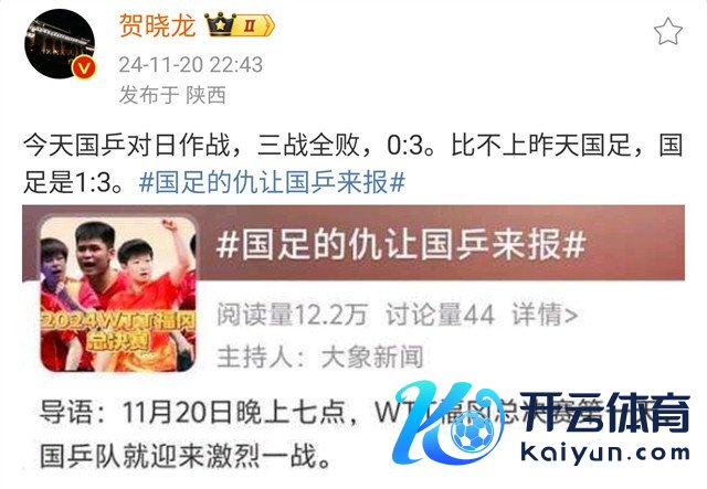 知名国乒批判员贺晓龙,又用他那一如既往的嘲讽体裁阴阳起来:“今天堂乒对日作战,三战全败,0-3。比不上昨天堂足的发扬,国足是1-3。”而他配的话题照旧“国足的仇让国乒来报”,嘲讽意味显而易见!