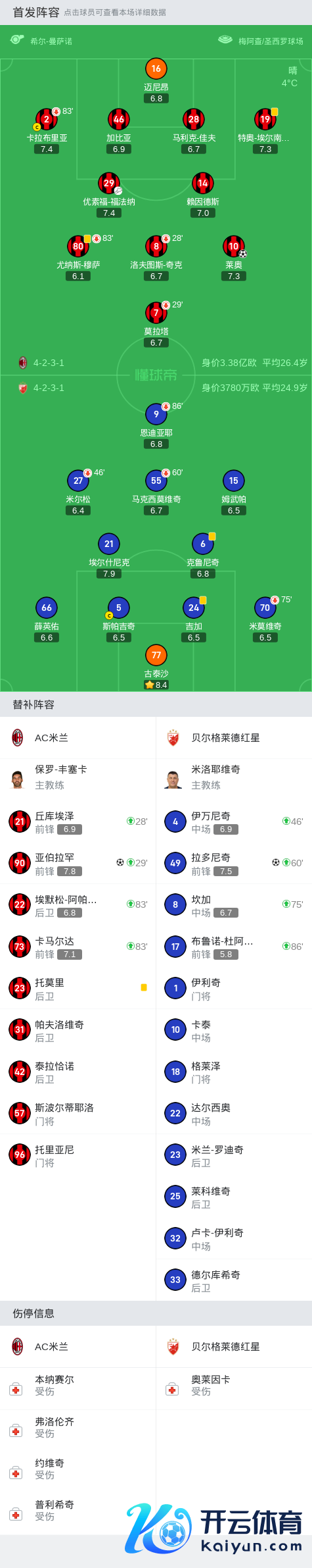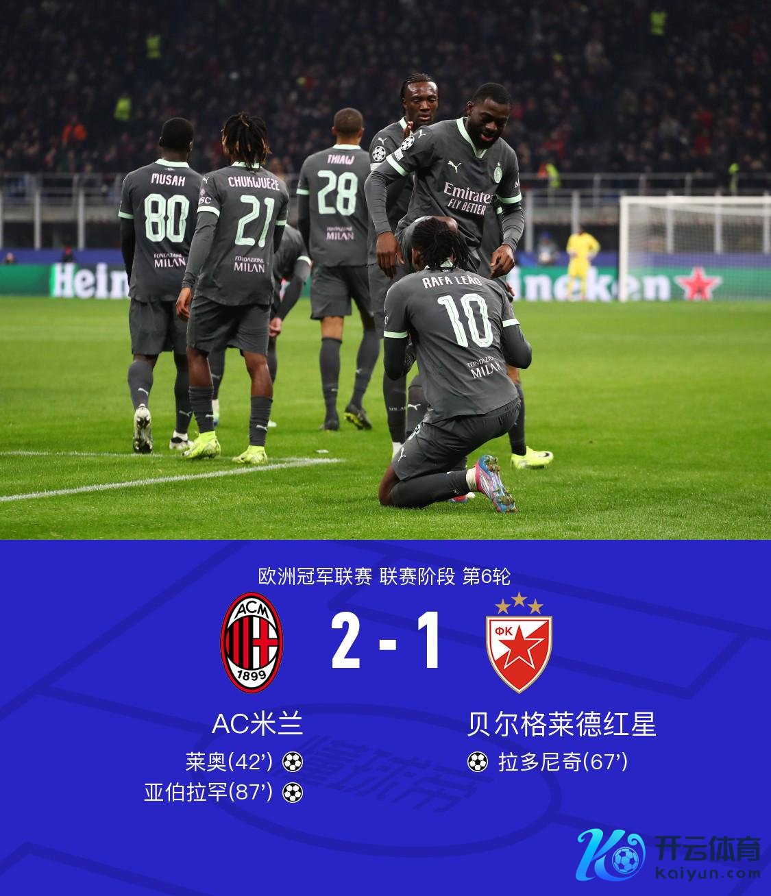 在欧洲冠军联赛的较量中,AC米兰迎战贝尔格莱德红星。上半场,凌空扫射弹地后中楣,奇克和莫拉塔先后受伤离场体育集锦,长传助攻莱奥单刀破门;下半场,穆萨弊端被断后拉多尼奇远射变线入彀,恩迪亚耶低射远角滑门而过,卡马尔达头球被扑后亚伯拉罕乱中补射绝杀。最终,AC米兰以2-1驯服贝尔格莱德红星。