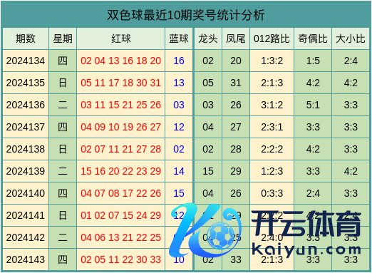 上期总结:双色球第2024143期:红球02、05、11、22、30、33;蓝球10,其中红球012路比为2:1:3,奇偶比为3:3,蓝球开出偶数号码10。