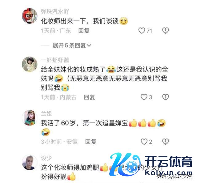 网友们也纷繁褒贬,“化妆师出来一下,咱们谈谈”,“给全妹化的妆太熟谙了,这如故咱们意志的全妹吗”,“素颜比这妆神情面多了,听大姨的,不化妆”,“原本挺颜面的,谁化的妆?这个化妆师要捣毁派司”。