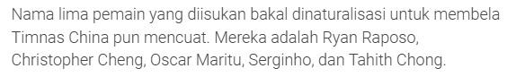 该印尼媒体以致列出了5名球员的具体名单,分离是:Ryan Raposo(伍小海)、Christopher Cheng(郑泽彦)、Oscar Maritu(小奥斯卡)、Serginho()、Tahith Chong(陈达毅)。
