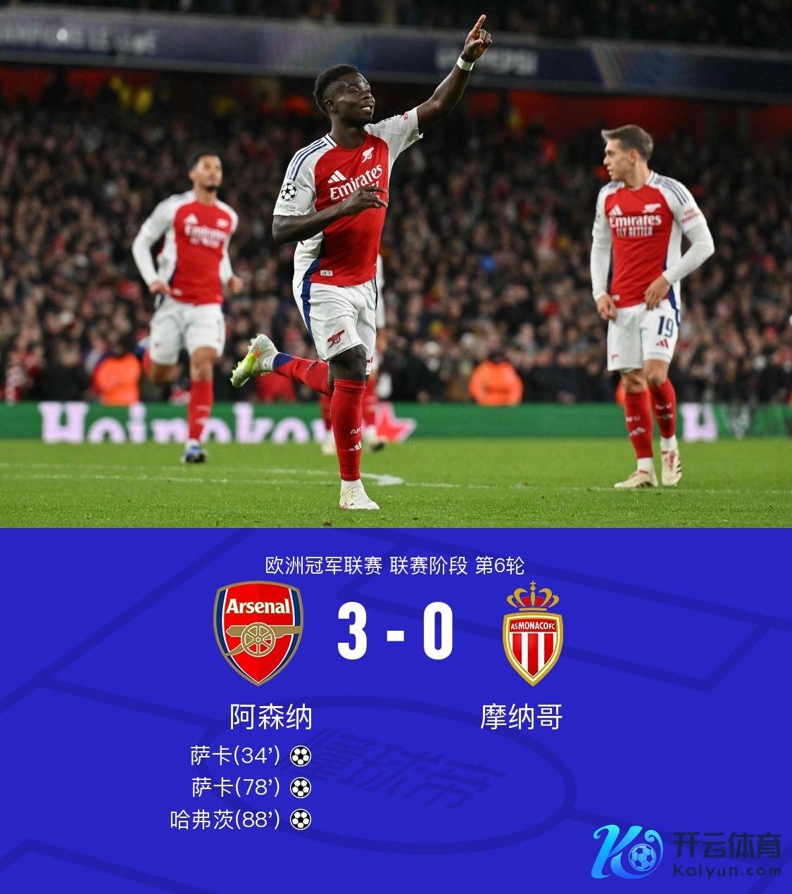 在欧洲冠军联赛的较量中,阿森纳与摩纳哥伸开对决。比赛中,阿森纳展现了庞杂的蹙迫实力。的精妙传球助力萨卡冲破僵局,随后萨利苏回传门将失实送出大礼,萨卡再度攻入一球扩大比分上风,比赛接近尾声时,萨卡也送出助攻,匡助哈弗茨锁定全场比分。最终,阿森纳以3-0的比分完胜摩纳哥。